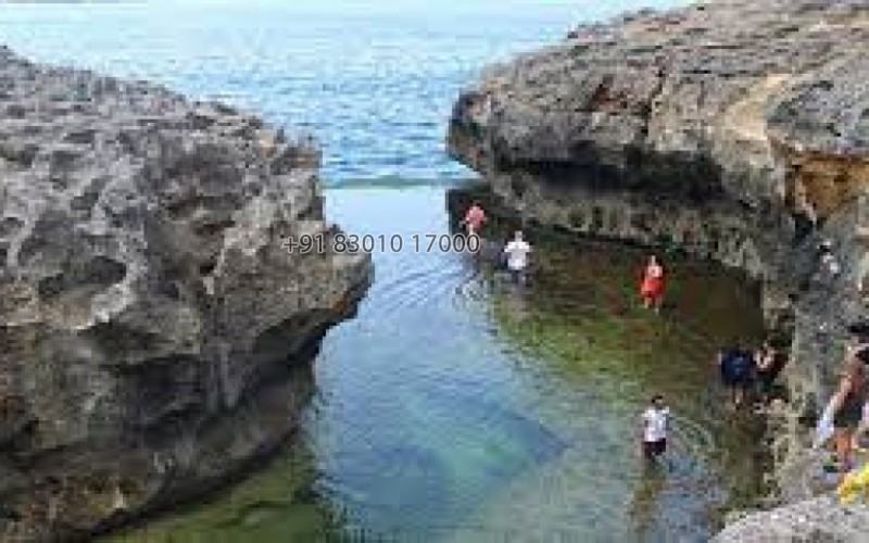 - You can descend into its crystal-clear rock pools for a swim or a soak, but only during low tide.